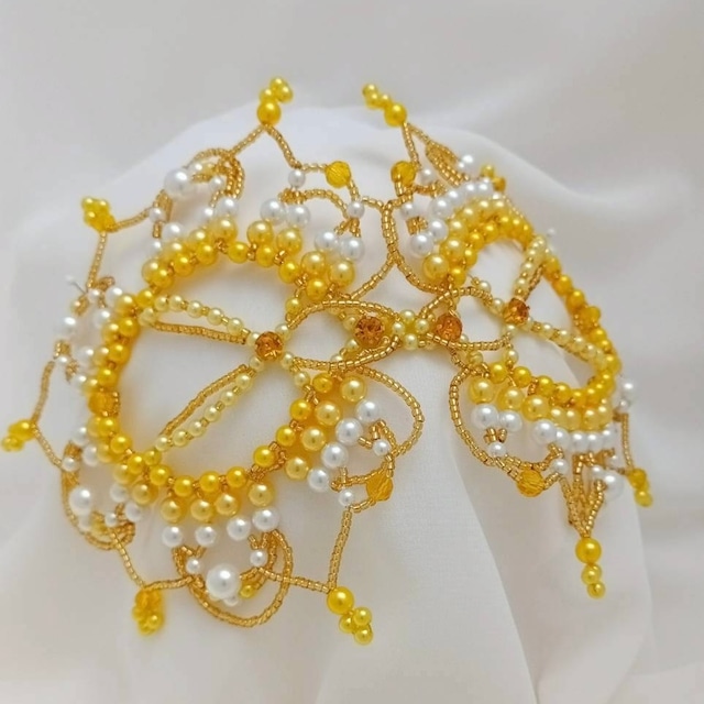 ビーズで編み上げた三角帽子に代わる頭飾り 小さなティアラを三角帽子の代わりに斜めにちょこんと乗せて 珍しくて可愛くて目立ちます